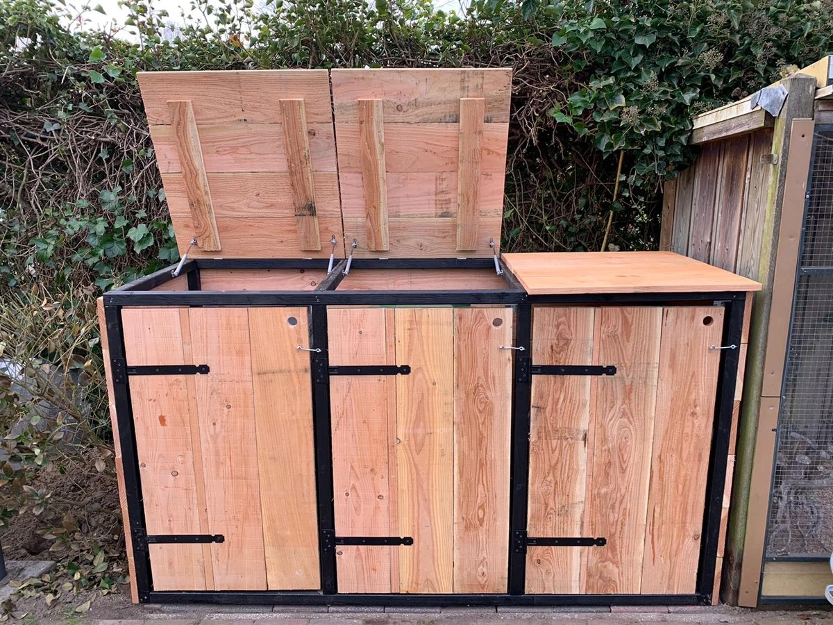deze container ombouw is op gebouwd uit een frame van tuinhout in combinatie met douglashout. de bak word volledig gemonteerd geplaatst en is daarom makkelijk voor u om te realiseren. de deksels zijn voorzien van haken zodat de deksel van de bak tegelijk opengaat met de deksel van uw container. het douglas hout word standaard onbehandeld geleverd en zal op den duur gaan vergrijzen tevens zit er bij deze bak standaard een achterwand in. en staat de bak op plastic dopjes zodat het minder makkelijk is voor vocht om in uw hout te trekken. De deksels gaan afzonderlijk van elkaar open, en de deuren word afgesloten met een windhaakje.
