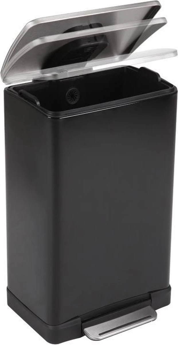 Deze stijlvolle glanzend zwarte EKO pedaalemmer met mat RVS deksel heeft een inhoud van 50 liter en is ideaal voor huishoudens van 2-3 personen. De prullenbak is voorzien van een extra breed pedaal en heeft een kunststof binnenemmer zodat je het vuil gemakkelijk weg kunt gooien. Daarnaast heeft de afvalbak een gedempt deksel waardoor deze geruisloos sluit, is de prullenbak fingerprintproof zodat er geen zichtbare vingerafdrukken op de prullenbak komen en heeft het een stay-open functie. Dit is ideal wanneer je je handen vol hebt en veel afval tegelijk weg wilt gooien. Aan de binnenzijde van het deksel is er ruimte voor een carbonfilter om nare geurtjes te voorkomen. Let op: deze wordt er niet standaard bijgeleverd.