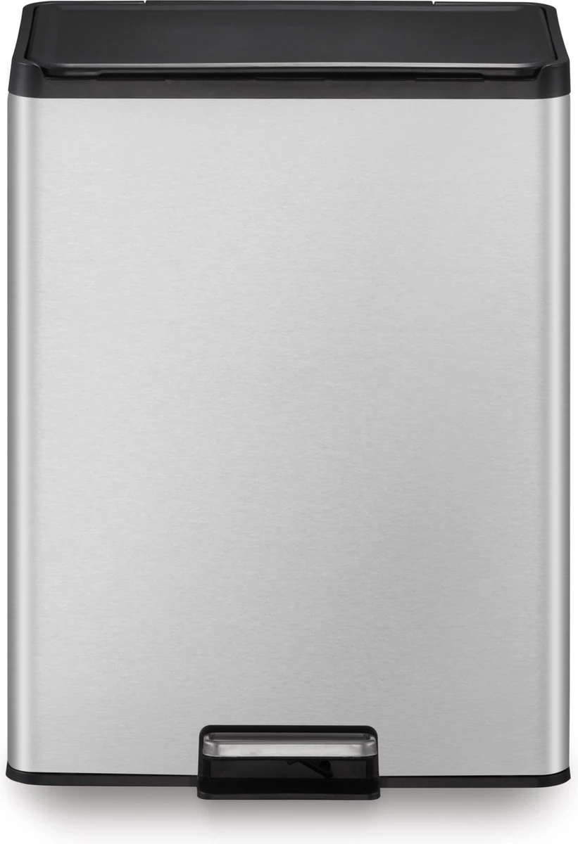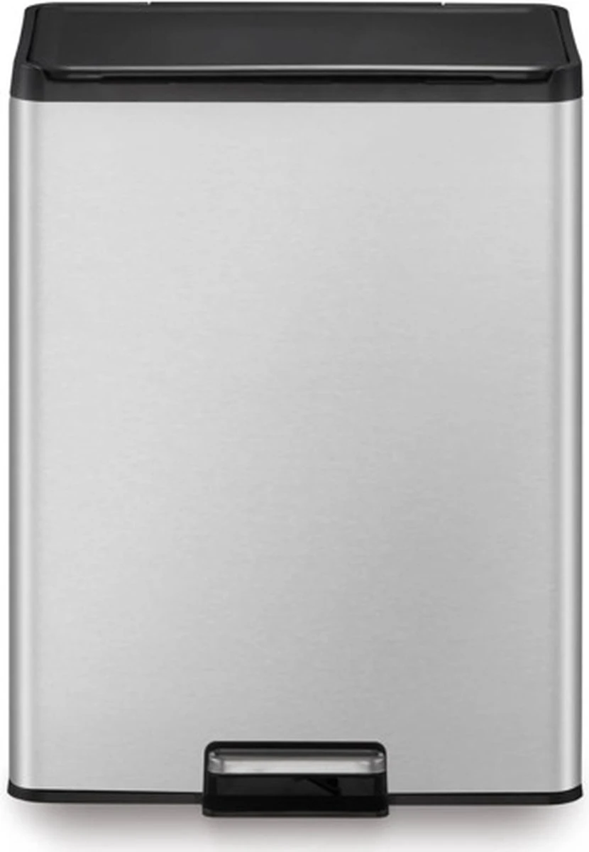 Rechthoekige pedaalemmer van geborsteld RVS met fingerprint proof coating en voorzien van gedempt sluitende deksels. Het pedaal geeft toegang tot de twee kunststof binnenemmers (2x 20 liter) voor het scheiden van afval. De stay-open functie vergrendelt het deksel, voor het makkelijk schoonmaken van de afvalbak of wisselen van de afvalzak.