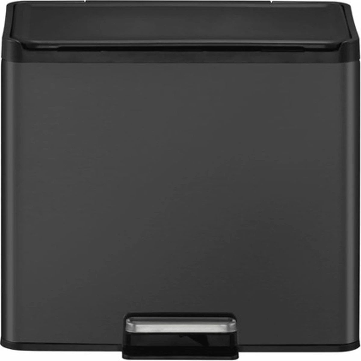 De zwarte EKO Essential pedaalemmer van 30 L is een trendy rechthoekige afvalemmer van geborsteld roestvrij staal met een vingerafdrukbestendige coating en heeft een kunststof deksel.