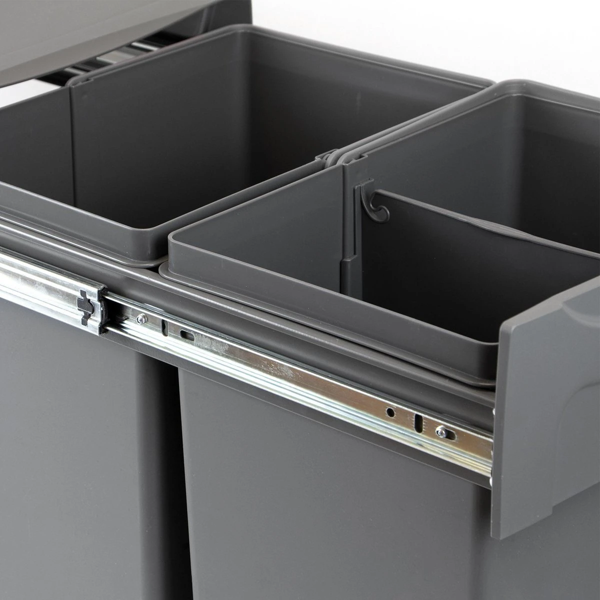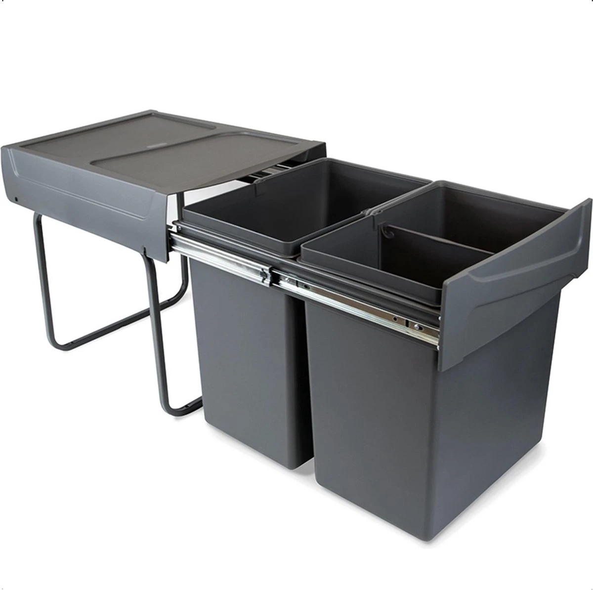Deze uittrekbare, inbouw prullenbak van Eleganca is een must-have om jouw keuken modern, hygiënisch en georganiseerd in te richten. Deze Eleganca afvalbak 2x20L is eenvoudig te monteren, vriendelijk in gebruik en gemaakt van hoge kwaliteit kunststof. Door het moderne design van deze inbouw afvalbak voor afvalscheiding, met uitneembare emmers van 2×20 liter en het formaat van B34,2 x D46.9 x H38.9 cm, past deze afvalbak mooi in elke keuken. De afvalemmer is voorzien van een metalen kogel gelagerd uittrekmechanisme en een rubberen stop voor het geluiddempend sluiten van de lade prullenbak. De afvalbak is geschikt voor huishoudelijk afval, is uittrekbaar en eenvoudig te monteren aan de bodem van een (keuken)kast voor een maximale gebruikerservaring. Hiernaast heeft één van de emmers een tussenschot om uw afval te scheiden.