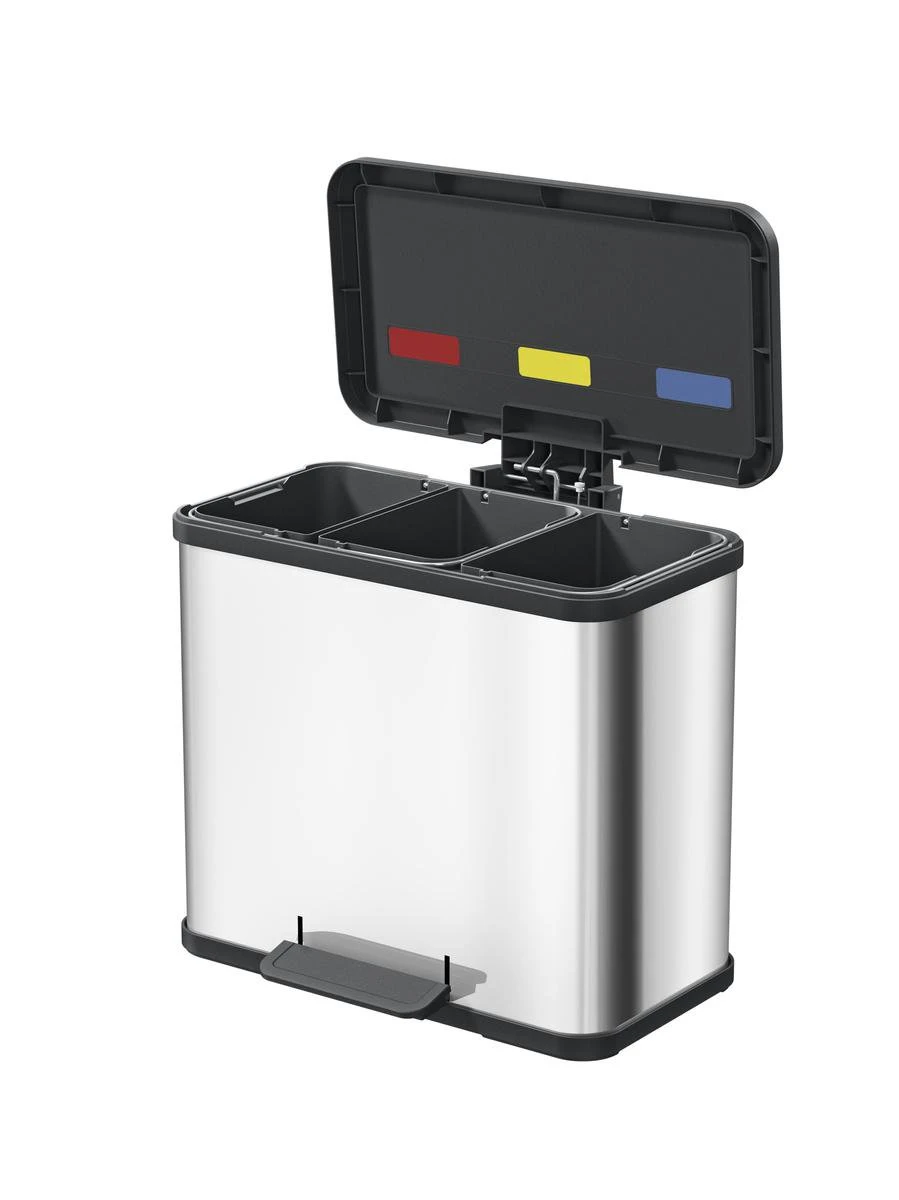 Afvalscheiding was nog nooit zo makkelijk als met deze afvalscheidingsprullenbak uit de Öko serie van Hailo. Vanwege zijn 3 componenten scheidt je standaard afval gemakkelijk van bijvoorbeeld GFT afval en plastic. De 3 bakken zijn uitneembaar en dus zonder moeite te reinigen. Het openen van de deksel kan hygiënisch met het ergnomisch brede voetpedaal en als de prullenbak weer sluit gebeurt dit zonder geluid dankzij de soft-close techniek.