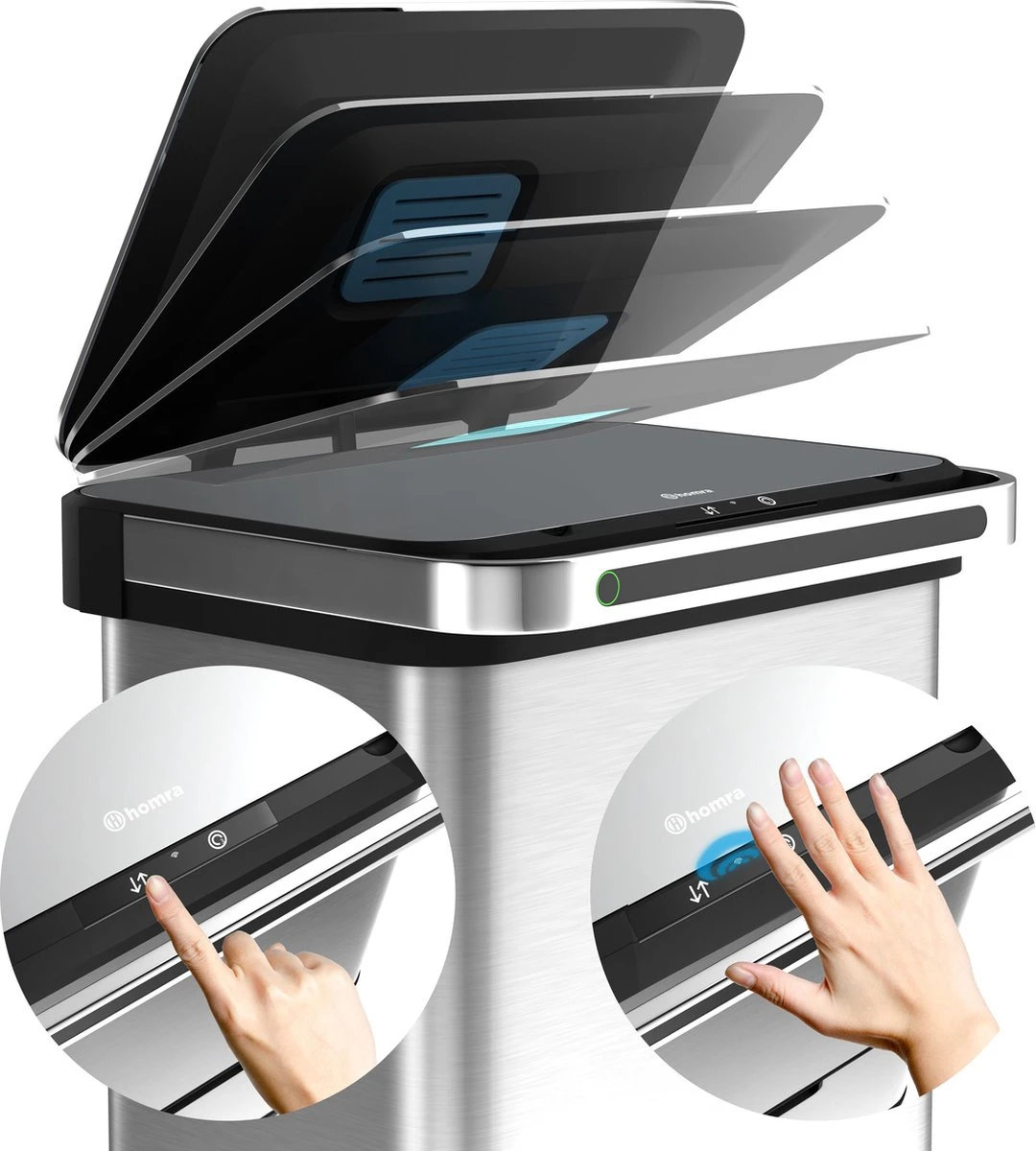 - PRAKTISCHE BEDIENING – Het is mogelijk om de bovenste twee compartimenten volledig contactloos te vullen. De sensor van de bovenste compartimenten reageert op beweging op een afstand van 15 tot 20 cm waarbij de deksel direct opengaat. Na 5 seconden sluit de deksel zich automatisch weer. De deksel is tevens handmatig te openen door een druk op de knop. De rolbare lade aan de onderzijde glijdt per handgreep naar voren en terug.
