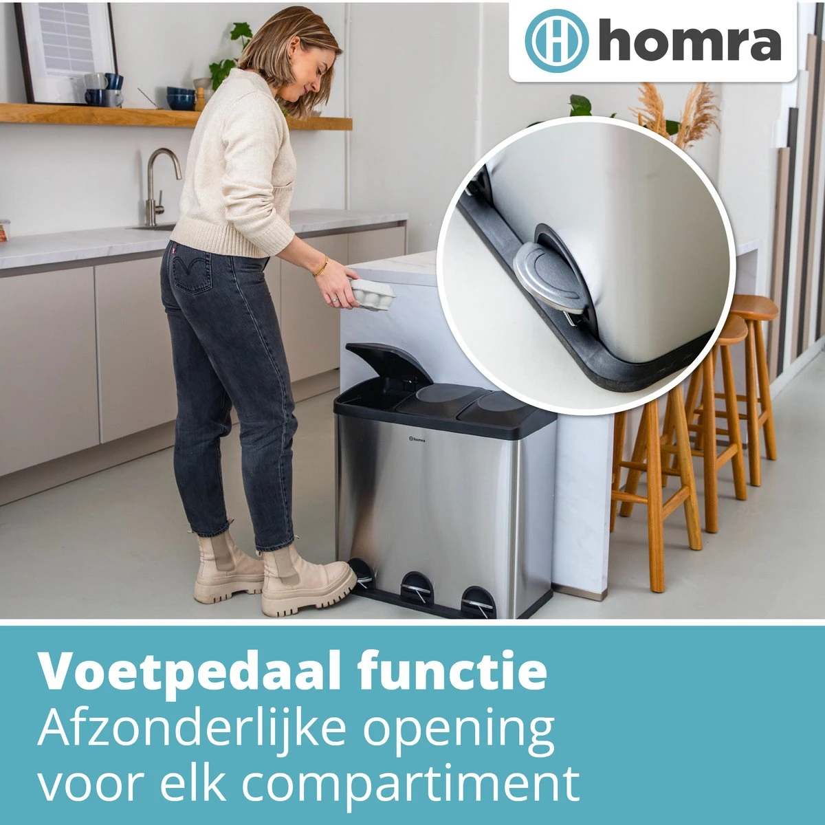 Mooie afvalscheidingsprullenbak met 60 liter inhoud (3 x 20 liter). Handig en hygiënisch in gebruik en met een luxe uitstraling. Deze pedaalemmer is ideaal voor thuis en op kantoor!