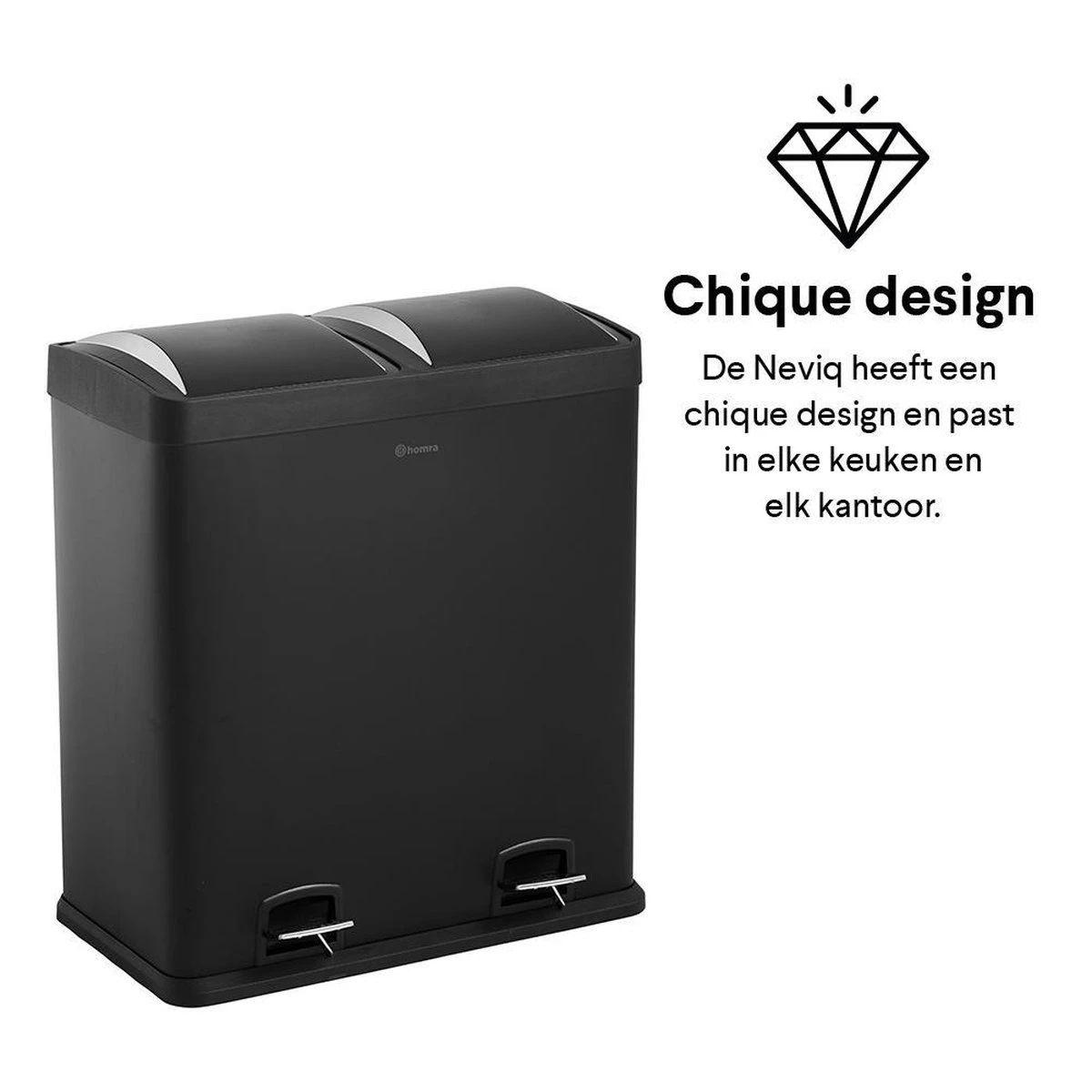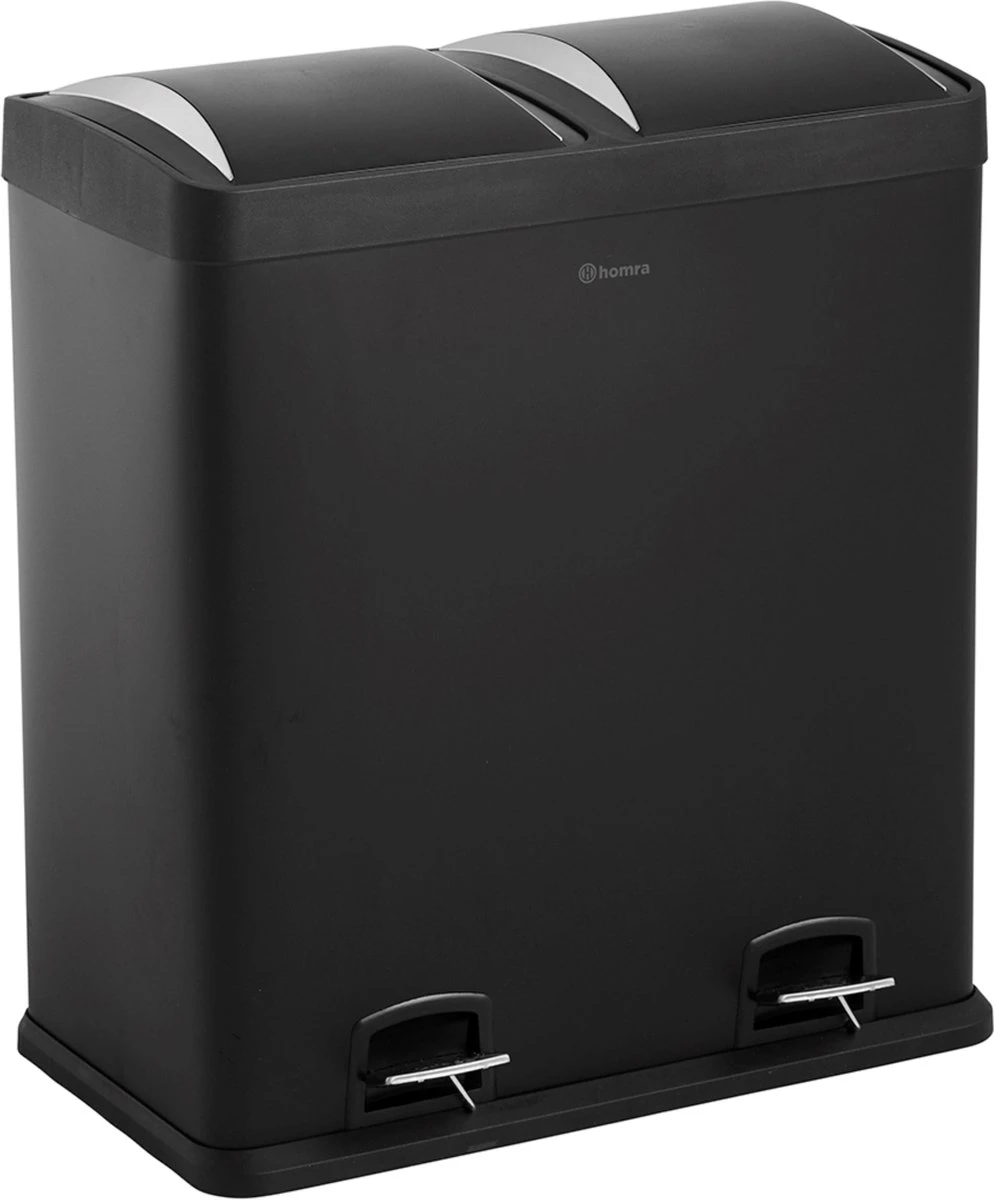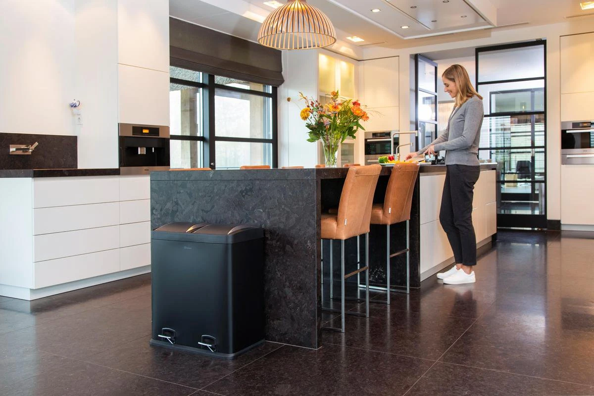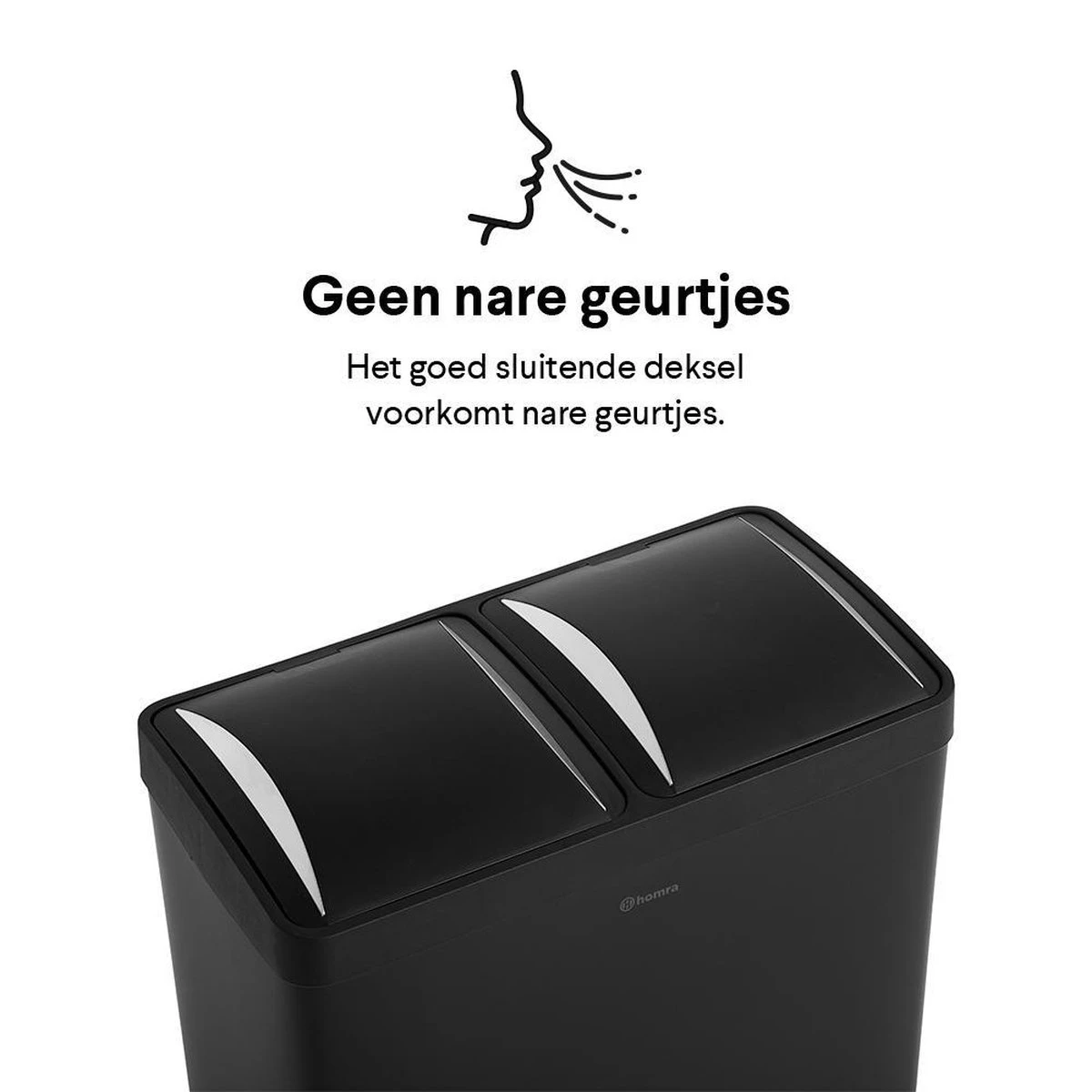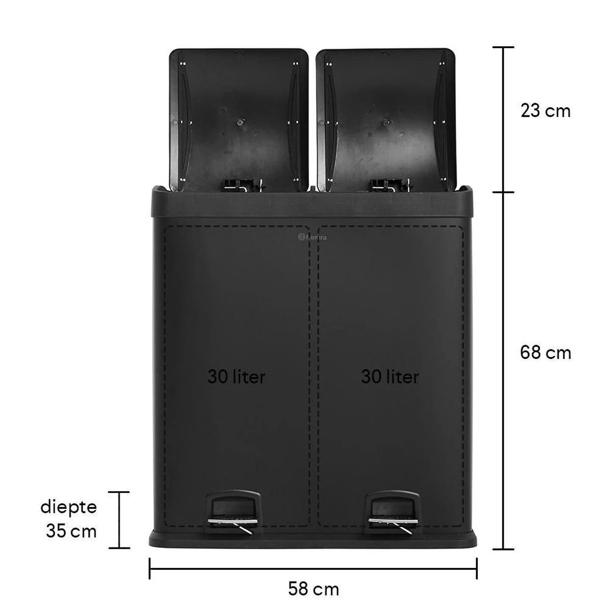 Mooie zwarte afvalscheidingsprullenbak met 60 liter inhoud (2 x 30 liter). Handig en hygiënisch in gebruik en met een luxe uitstraling. Ideaal voor thuis en op kantoor!