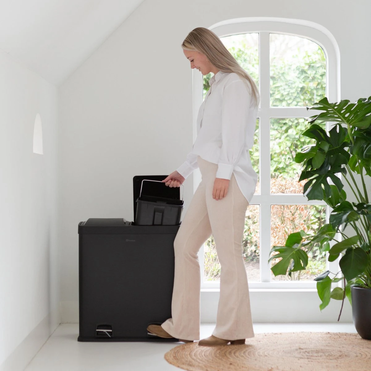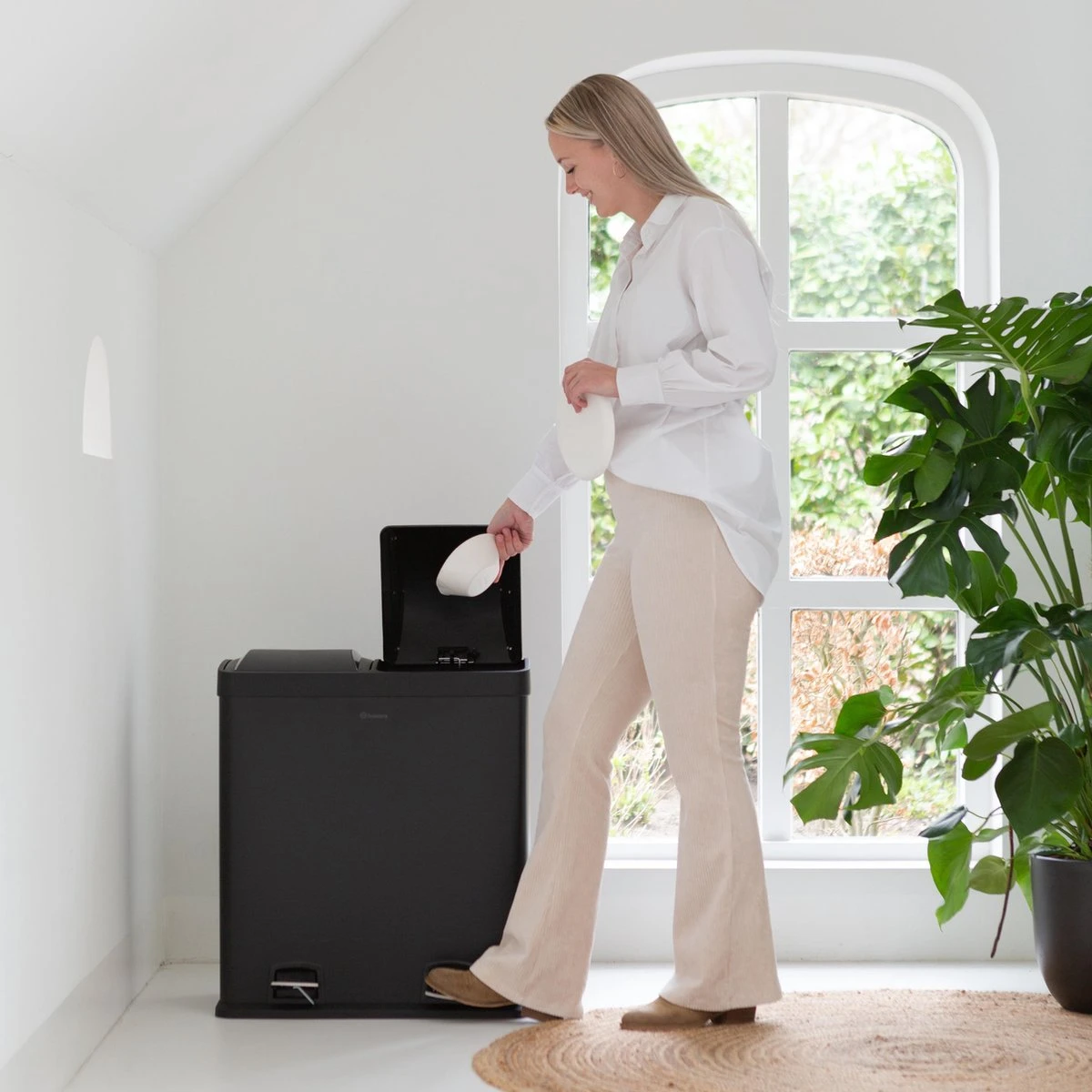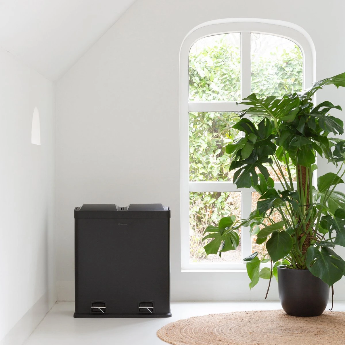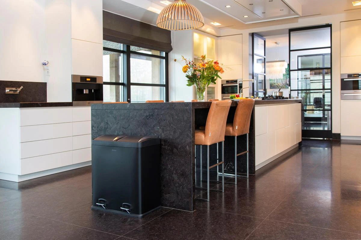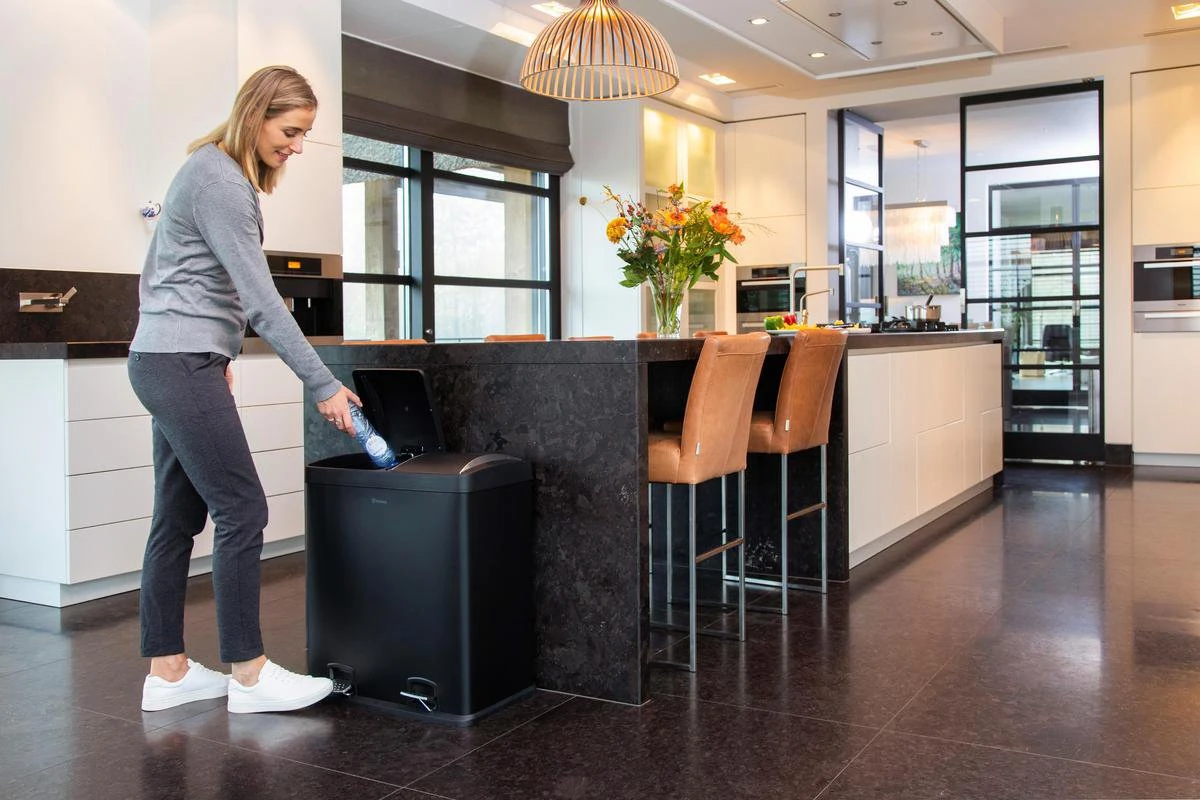 Mooie zwarte afvalscheidingsprullenbak met 60 liter inhoud (2 x 30 liter). Handig en hygiënisch in gebruik en met een luxe uitstraling. Ideaal voor thuis en op kantoor!