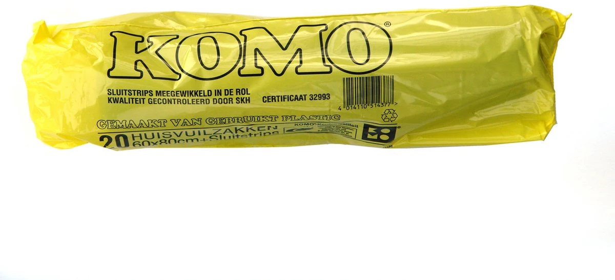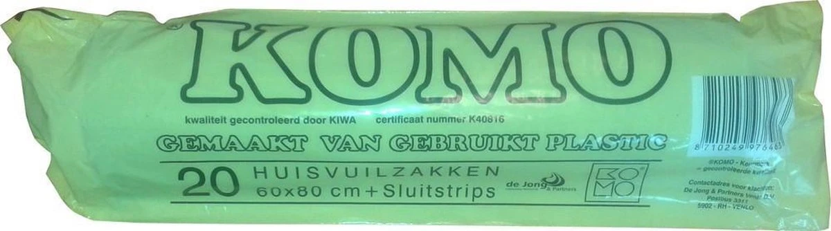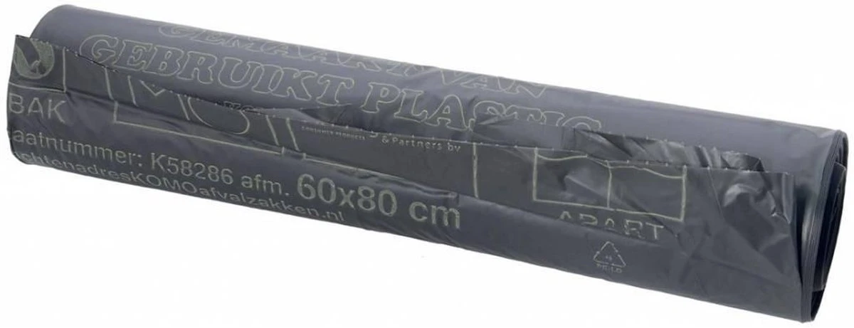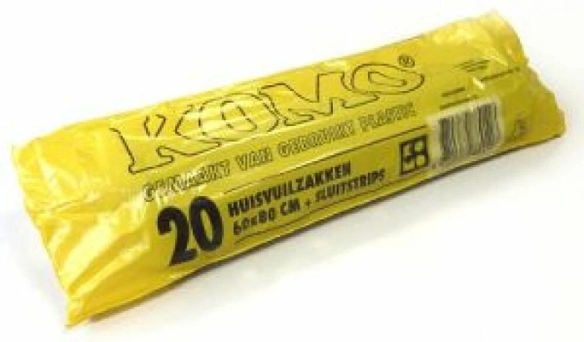 De bekende Vero KOMO huisvuilzak. In deze afvalzak past wel 60 liter vuil. De sterke vuilniszak is grijs en er zitten er 20 in een rol.