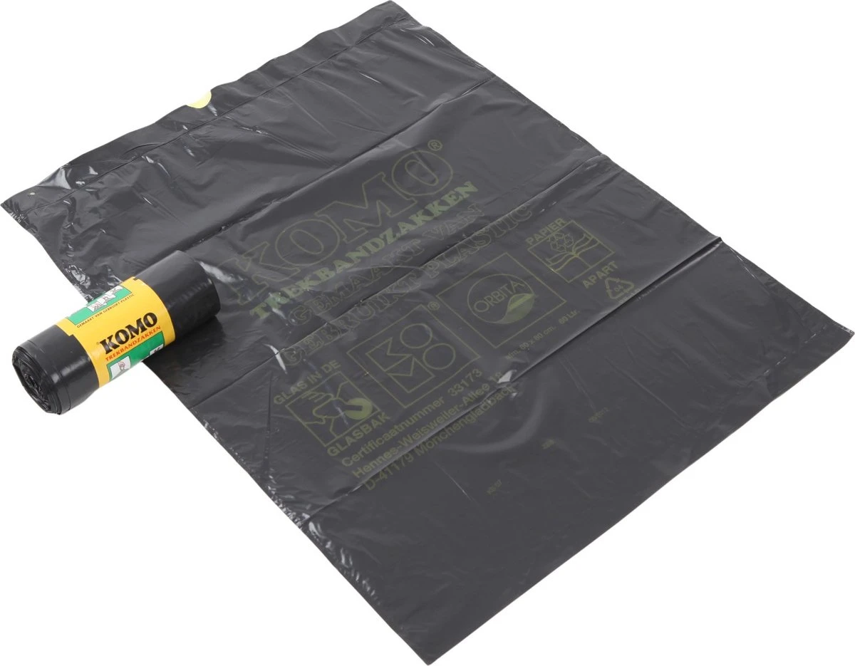 Komo huisvuilzakken, de bekende sterke grijze vuilniszakken met de gele opdruk hebben een inhoud van 60 liter en zijn voorzien van een handige trekbandsluiting. Deze vuilniszakken van 60×80 cm. worden per volle omdoos van 20 rollen à 15 zakken verkocht. Prijs per volle doos 300 vuilniszakken.
