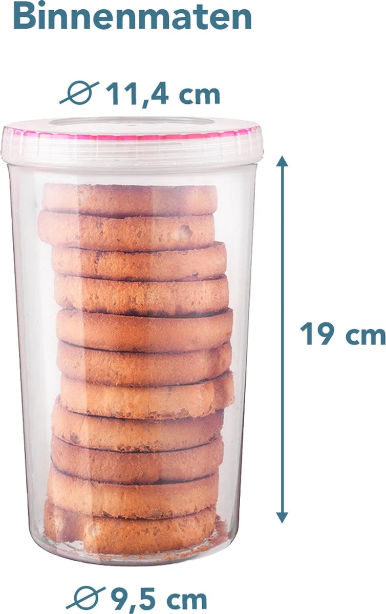 Hoge ronde LOCK&LOCK beschuitbus (set van 2 stuks) met draaideksel. Handig als voorraadbus voor beschuit, want houdt je rol beschuit heel lang knapperig door de luchtdichte afsluiting. Maar ook zeer geschikt voor het bewaren van rijstwafels, pasta en andere droogwaren.