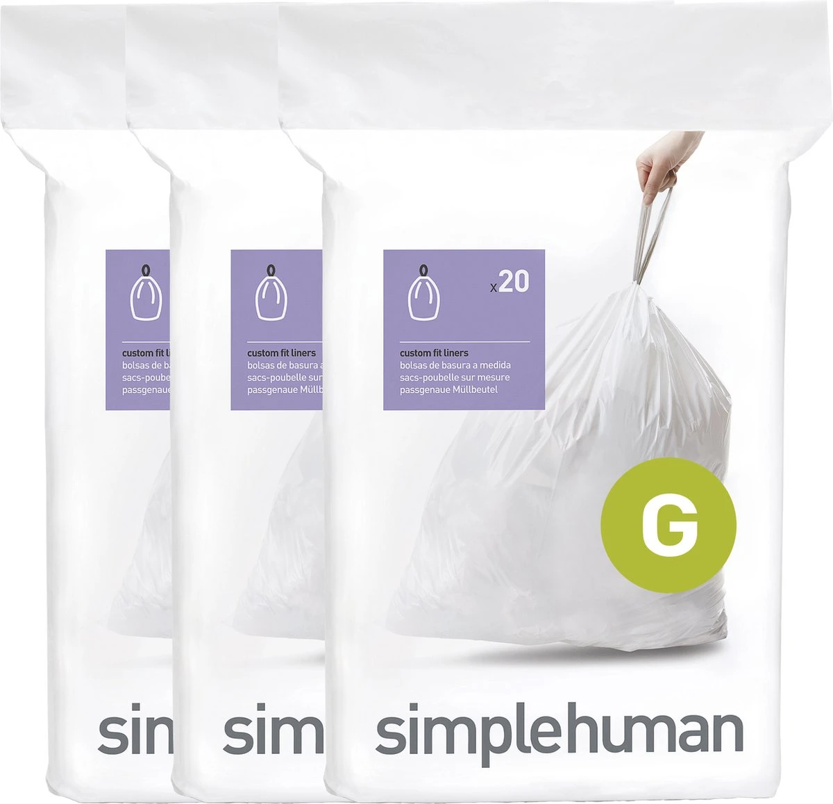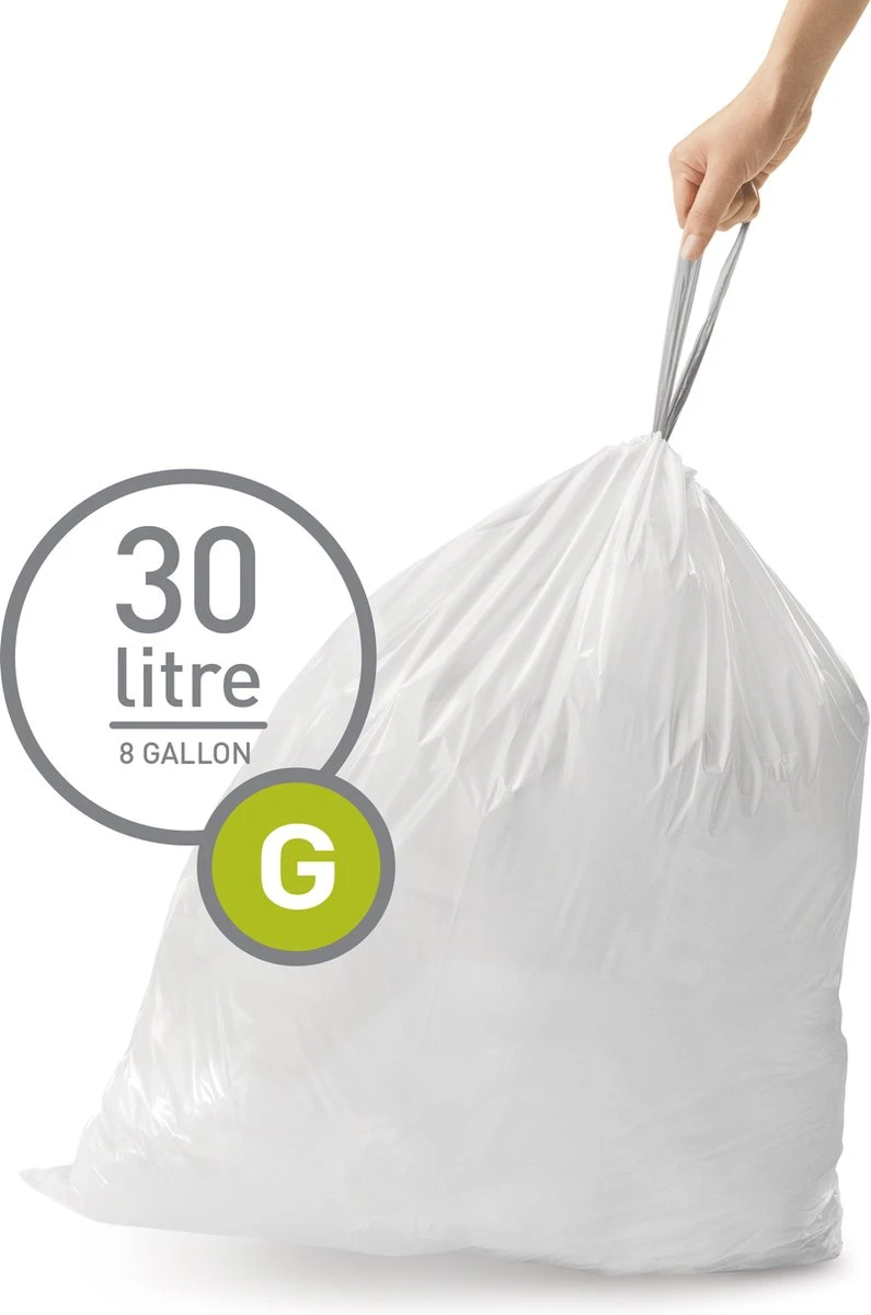 Deze code G afvalzakken van Simplehuman hebben een inhoud van 30 liter en zijn gemakkelijk te sluiten met een trekkoord. Doordat de zakken zijn voorzien van dubbele naden, zijn ze extra stevig. Deze zakken zijn ontworpen om perfect in de afvalemmers van Simplehuman te passen, zodat ze niet wegglijden en volledig verborgen blijven wanneer het deksel gesloten is. In één verpakking zitten 3 pakken van 20 stuks. Daarnaast zijn deze vuilniszakken perfect om in de Pocket Liner gleuf van de Simplehuman afvalbakken te stoppen.
