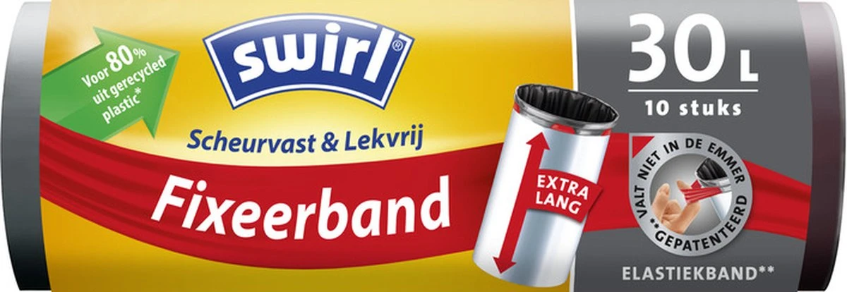 De Swirl® pedaalemmer afvalzak is gemakkelijk om de rand van de binnenbak van de pedaalemmer te bevestigen. De elastische fixeerband voorkomt dat de zak wegglijdt en de emmer vuil wordt. Heel eenvoudig en echt praktisch! Ook het verwijderen van het afval is heel eenvoudig: Leg gewoon een knoop in de elastische fixeerband en u heeft een praktisch handvat. Swirl® Fixeerband pedaalemmer afvalzakken zijn scheurvast en waterdicht en zijn gemaakt van minstens 80% gerecycled plastic en daarvan is minstens de helft (40%) afkomstig uit post-consumer plastic afval